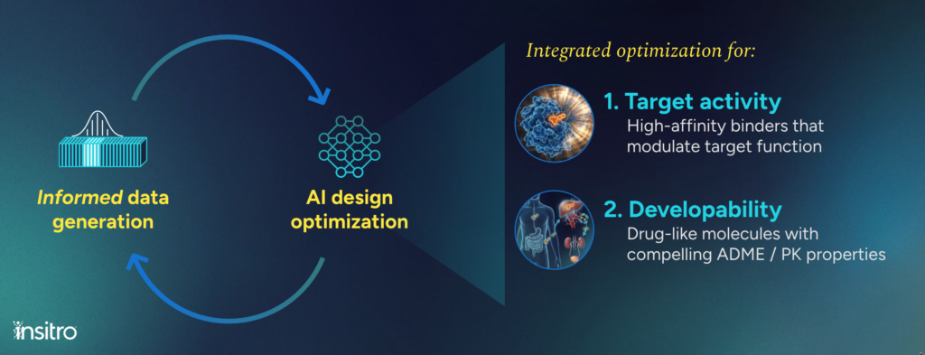 TherML™ (Therapeutics Machine Learning) is insitro’s integrated design engine, built to reverse this logic. Spanning small molecules, oligonucleotides, and complex biologics within a single platform, TherML transitions drug discovery from stochastic screening to predictive and adaptive engineering, simultaneously optimizing for both potency and developability in silico before committing substantial resources.